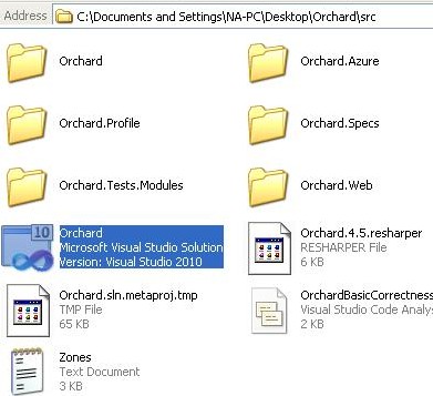 Now open the "Orchard" solution in Visual Studio (just double click on the solution file). You can see the highlighted solution file in the screenshot below: